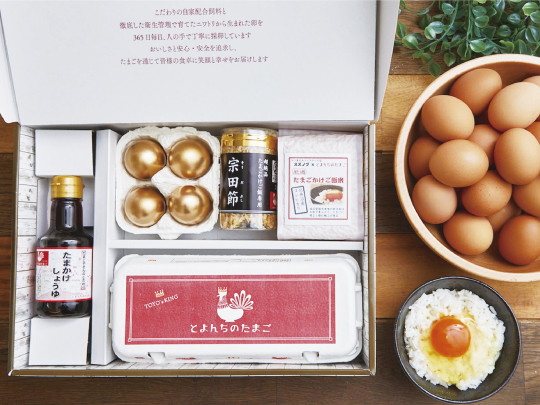 新鮮な卵ならではの凝縮した旨味を楽しめる「たまごかけごはんセット」は、厳選の専用醤油と節に、卵の甘さと旨味をより感じることのできる新潟県の米北魚沼産コシヒカリがセットになっています。