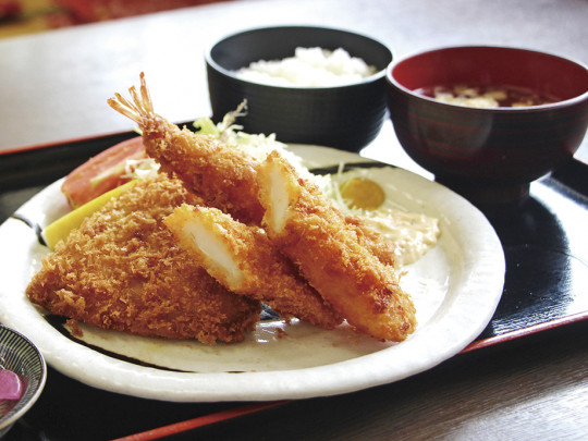 揚げ物の王道、アジ・エビ・イカの3種の組み合わせです。イカフライをカキフライにできます。