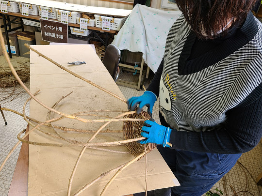 今まで参加したことがない方に、最初の蔓取りからツルカゴづくりまで教えます。(お昼休憩をはさみます)