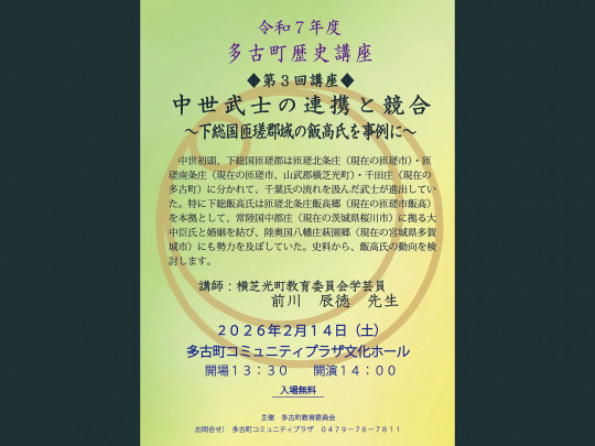 3/28(土)令和7年度 多古町歴史講座 第4回講座 多古町の歴史と城を知って、もっと多古町を好きになる