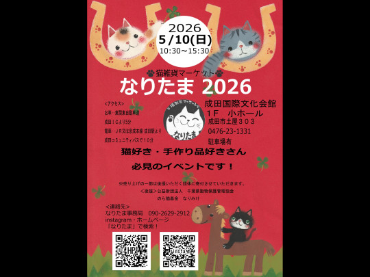 様々なハンドメイド猫作品が大集合!キッチンカーや手作りお菓子なども並びます。猫好き、手作り好きさん必見のイベントです。売上の一部は、千葉県動物保護管理協会等に寄付されます。