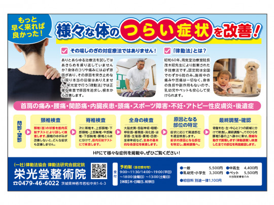 ありとあらゆる治療法を試してはあきらめを繰り返していませんか?身体のコリや痛みには必ず原因があり、その原因を突き止めない限り本当の回復はありえません。栄光堂で行う「律動法」では正確な検査で原因を追求し、根本から改善します。