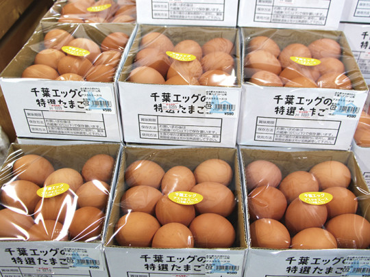 種類豊富な養鶏場のとれたて卵。品切れがないよう常に補充されています。